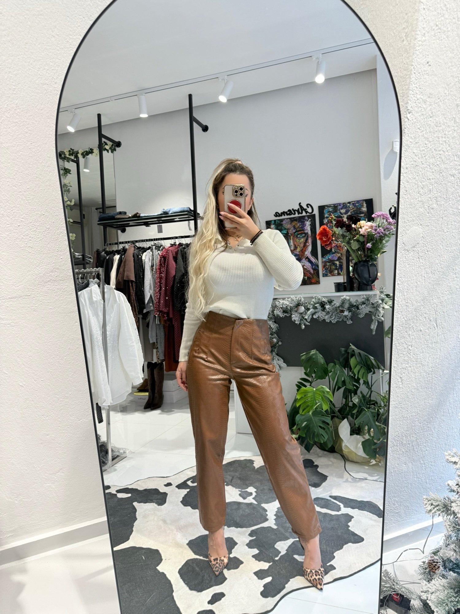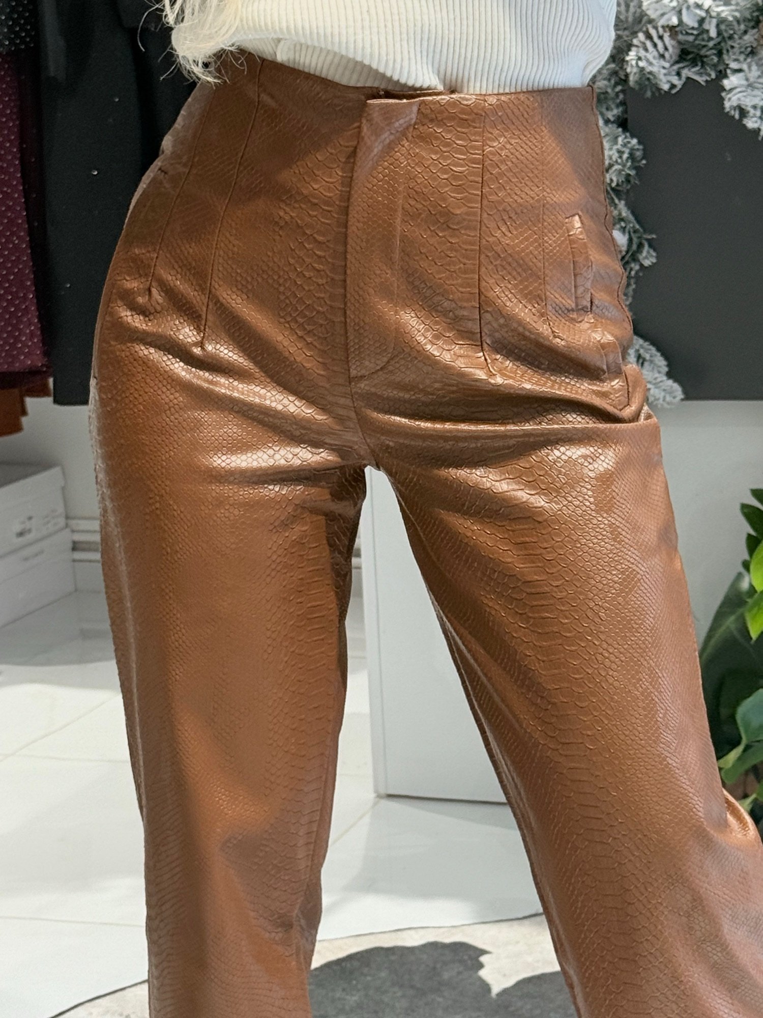 Αναβαθμίστε το στυλ σας με ένα κομμάτι που μαγνητίζει τα βλέμματα. Αυτό το παντελόνι από υψηλής ποιότητας δερματίνη συνδυάζει την πολυτέλεια του snakeskin εφέ με μια μοντέρνα, θηλυκή γραμμή.
