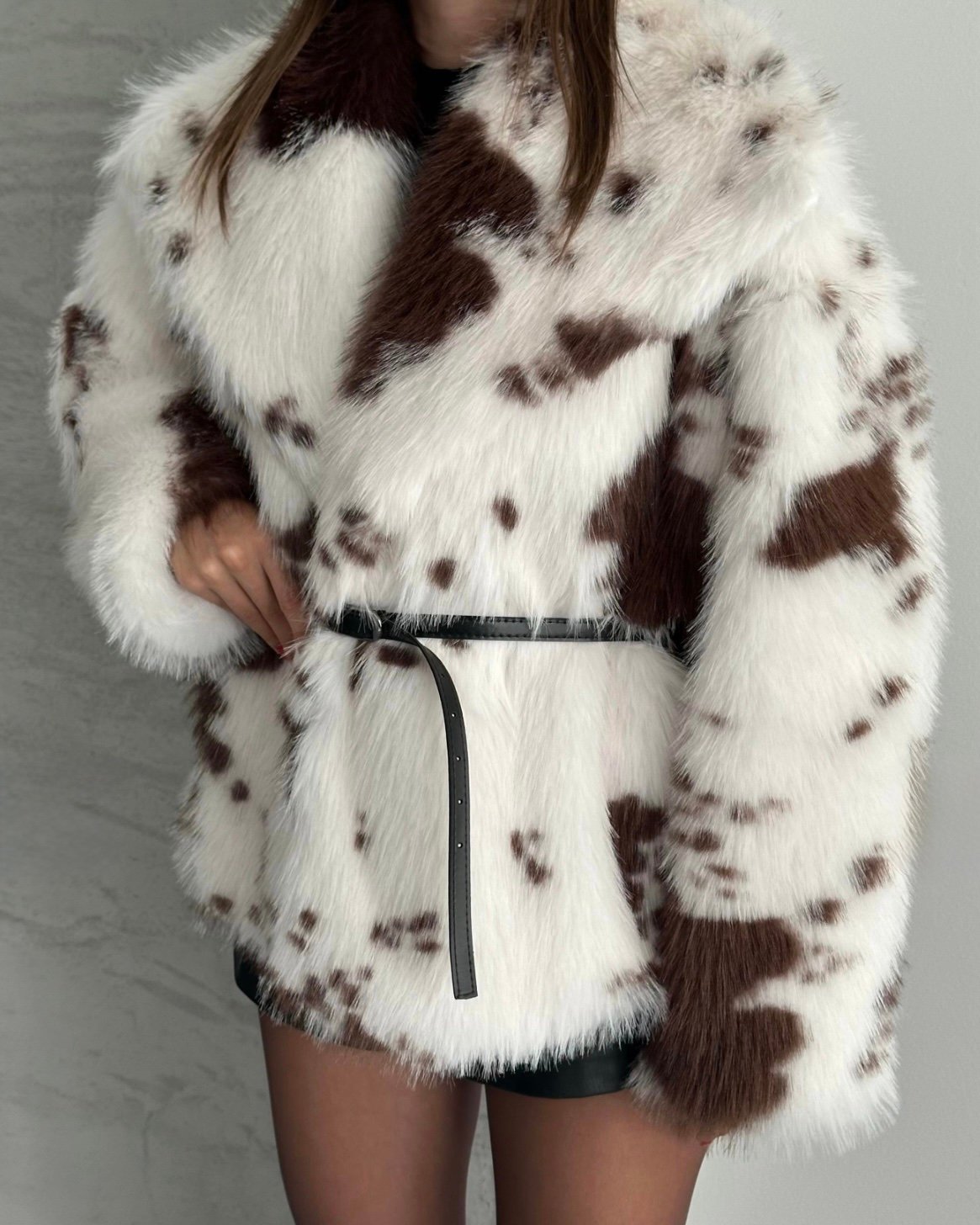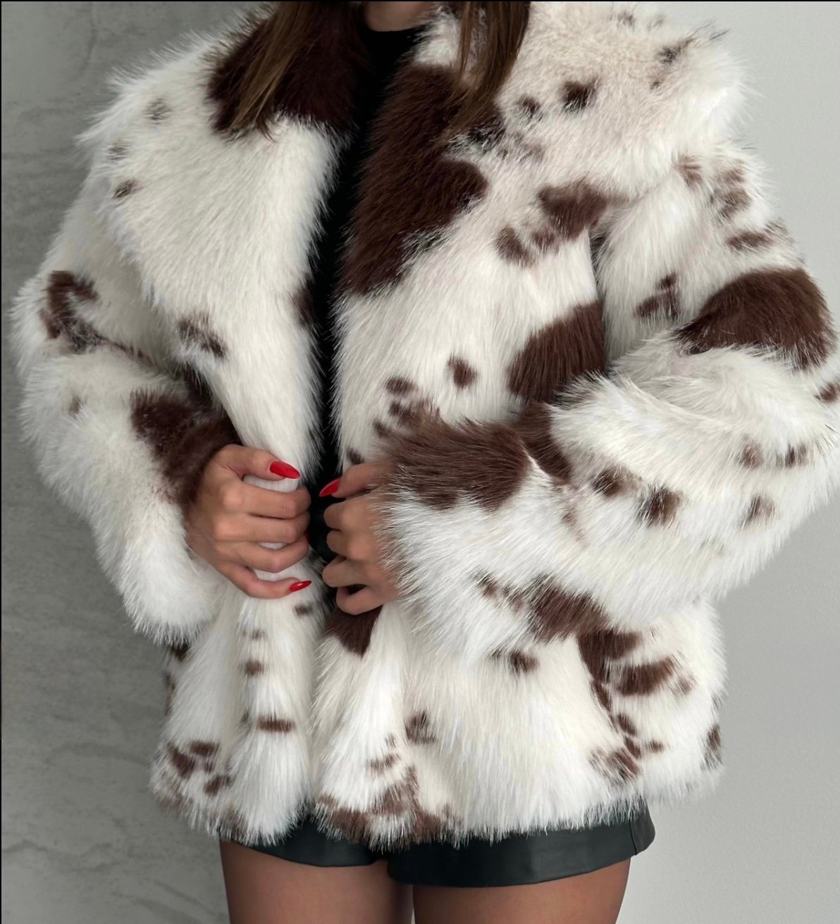 Αυτό το εκπληκτικό faux fur παλτό με το ζωηρό καφέ-λευκό κηλιδωτό μοτίβο (cow print) είναι ο εύκολος τρόπος να αναβαθμίσετε κάθε εμφάνιση. Φτιαγμένο από πλούσια γούνα, προσφέρει απαράμιλλη ζεστασιά και μια δόση ρετρό-chic αισθητικής.