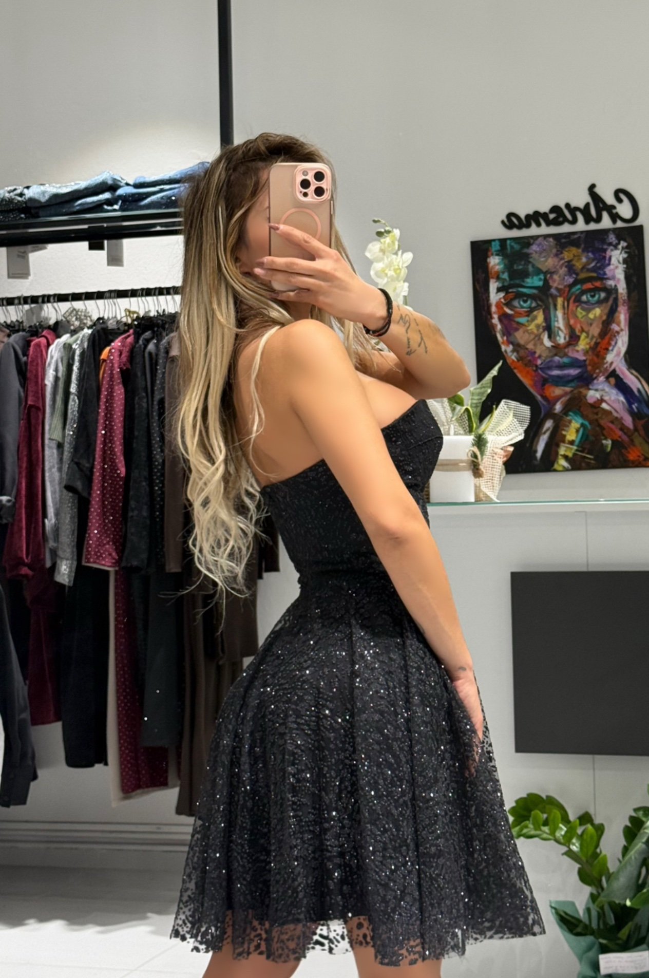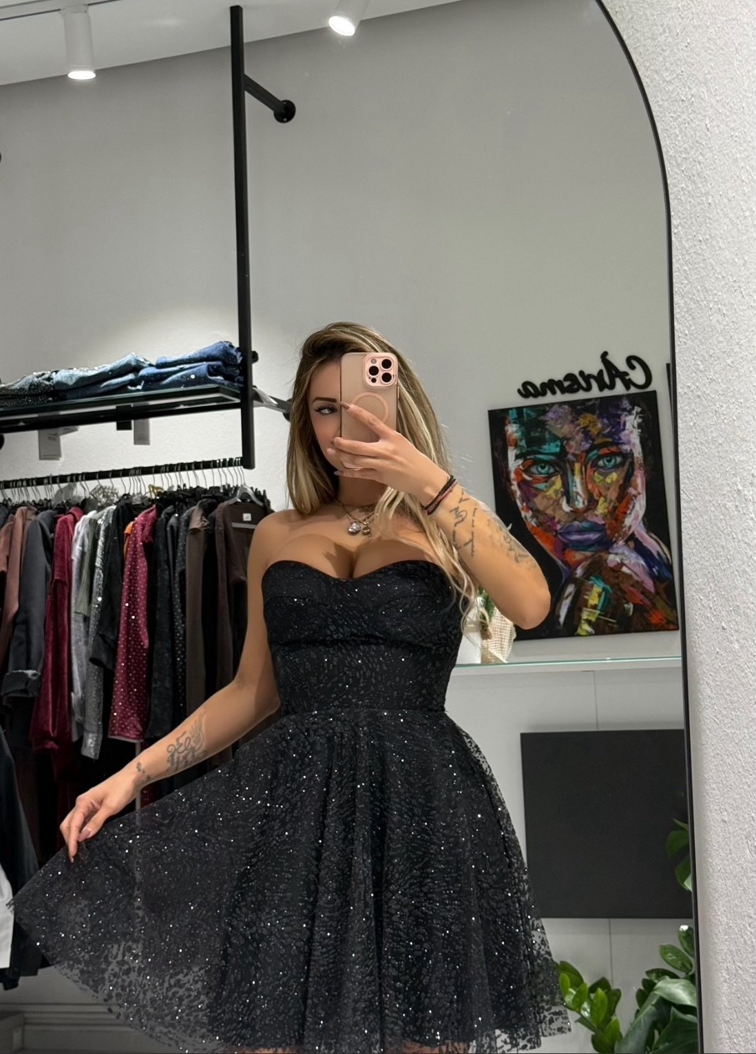 Κάντε τα βλέμματα να στραφούν πάνω σας! Το Stella Glitter Mini Dress είναι το κομμάτι-κλειδί για κάθε επίσημη και λαμπερή εμφάνιση. Το εντυπωσιακό μαύρο ύφασμα είναι πλούσια διακοσμημένο με αστραφτερό glitter, προσφέροντας μια μοναδική, εκθαμβωτική λάμψη που τραβάει την προσοχή.