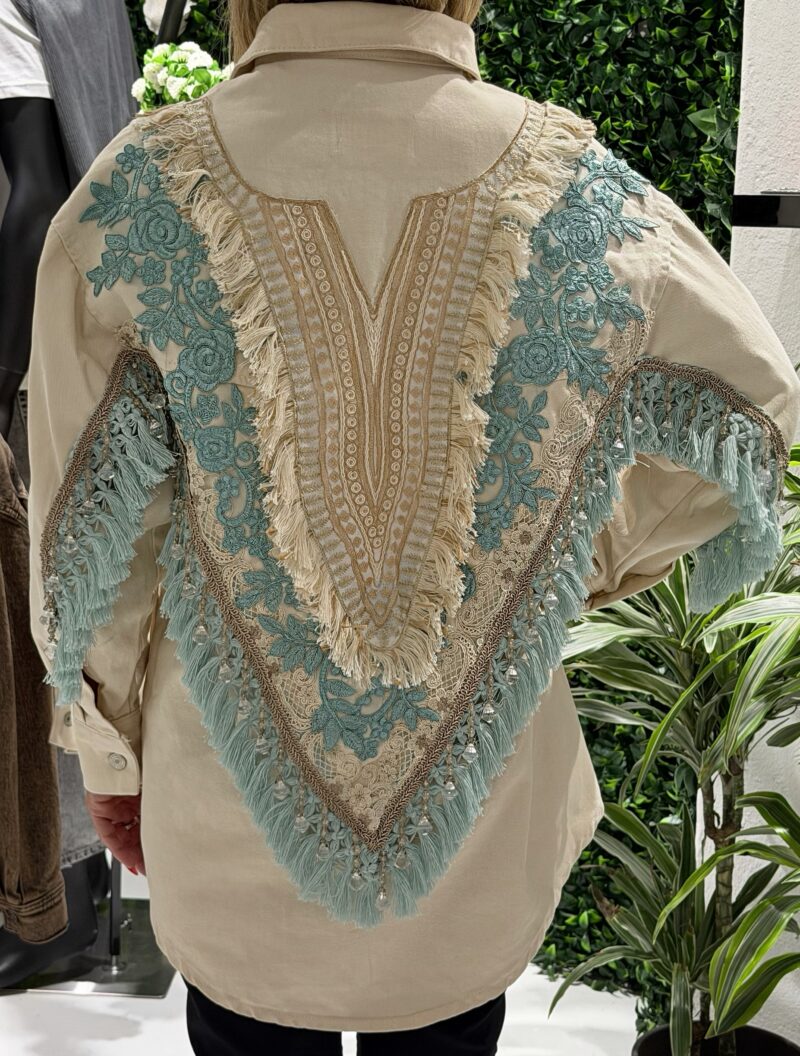 • Intricate Turquoise Embroidery: Ένα εντυπωσιακό, τρισδιάστατο κέντημα με έντονο, τιρκουάζ χρώμα, που καλύπτει το πάνω μέρος της πλάτης.