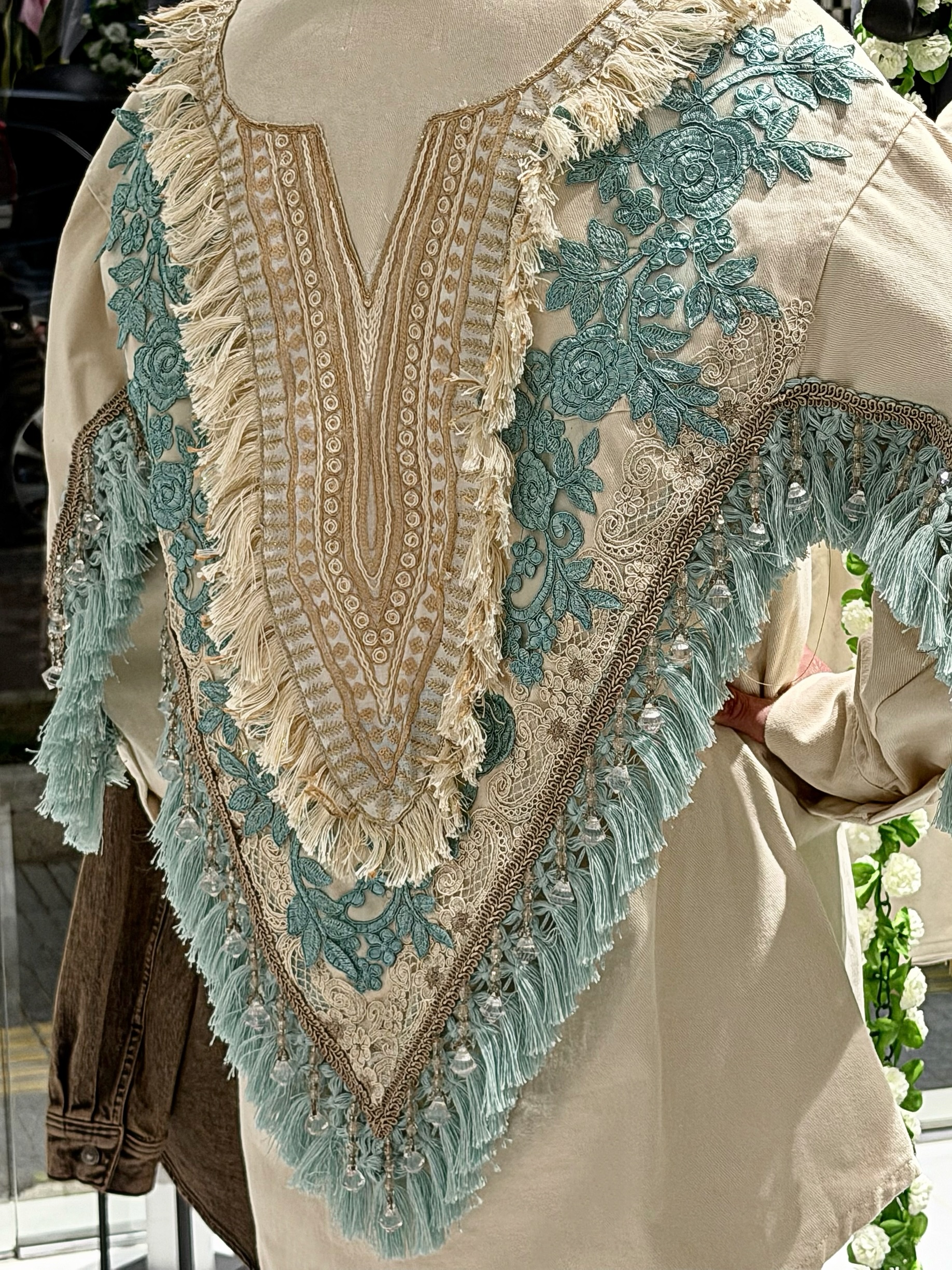 • Dramatic Scarf Back Panel: Το κάτω μέρος της πλάτης καλύπτεται από ένα εντυπωσιακό ύφασμα με paisley μοτίβο, που καταλήγει σε πυκνά, denim κρόσσια.