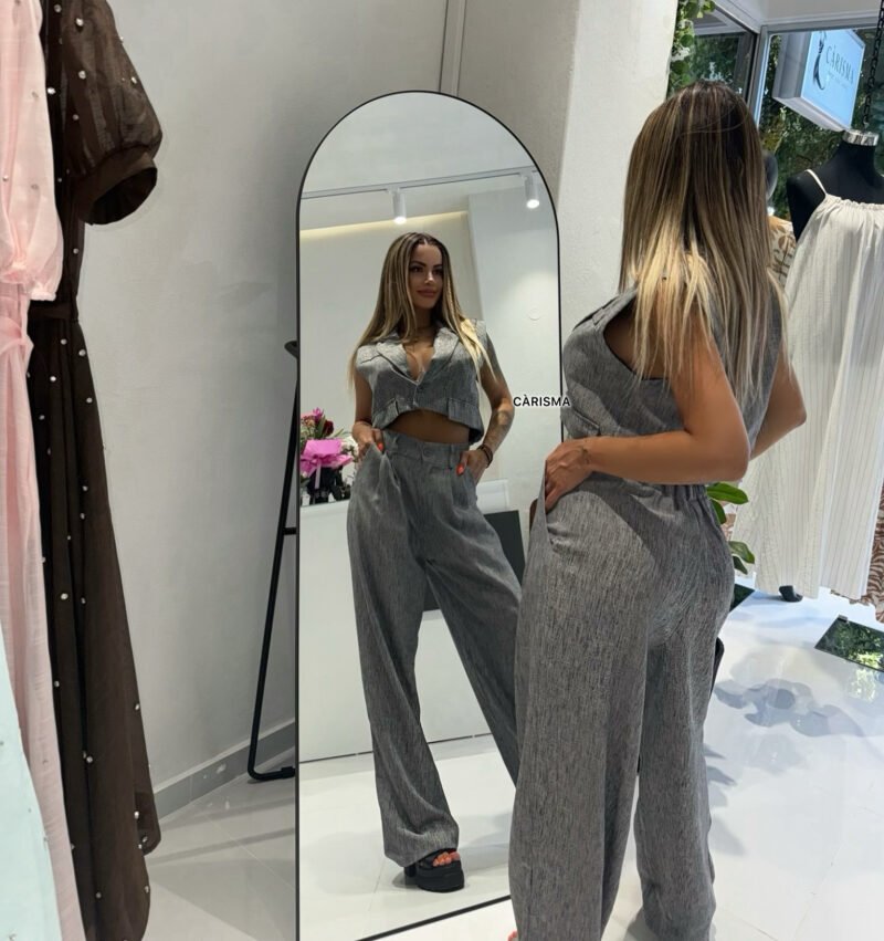 Η πιο ήσυχη αλλά εξίσου εντυπωσιακή εκδοχή του Vera. Το γκρι αυτό ύφασμα με την ανάλαφρη υφή “δουλεύει” όλες τις ώρες της ημέρας και δίνει την αίσθηση του effortless chic. Το τοπ αναδεικνύει το σώμα χωρίς υπερβολές και το παντελόνι απογειώνει τη σιλουέτα με τη διακριτική του κίνηση. Φόρεσέ το με nude, μαύρα ή λευκά αξεσουάρ.