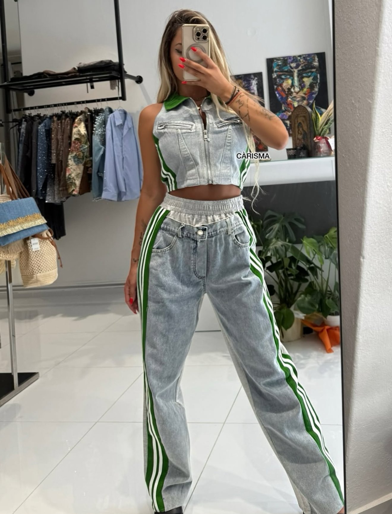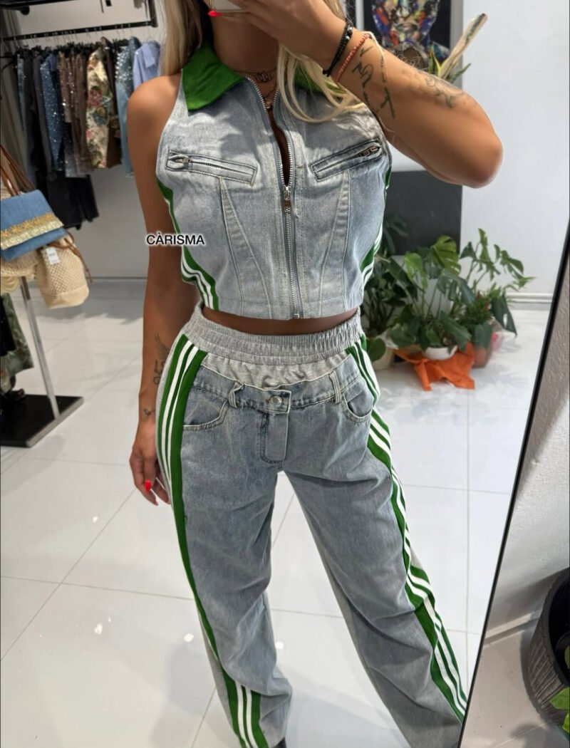 Το σετ Vérdia συνδυάζει sport και denim vibes σε μία τολμηρή, μοντέρνα εκδοχή. Το cropped τζιν γιλέκο με πράσινες λεπτομέρειες αγκαλιάζει τη μέση, ενώ το ψηλόμεσο παντελόνι με τις διπλές πράσινες ρίγες χαρίζει επιμήκυνση και δυναμισμό στη σιλουέτα. Ένα urban chic outfit που ξεχωρίζει, ιδανικό για street looks με έντονη προσωπικότητα.