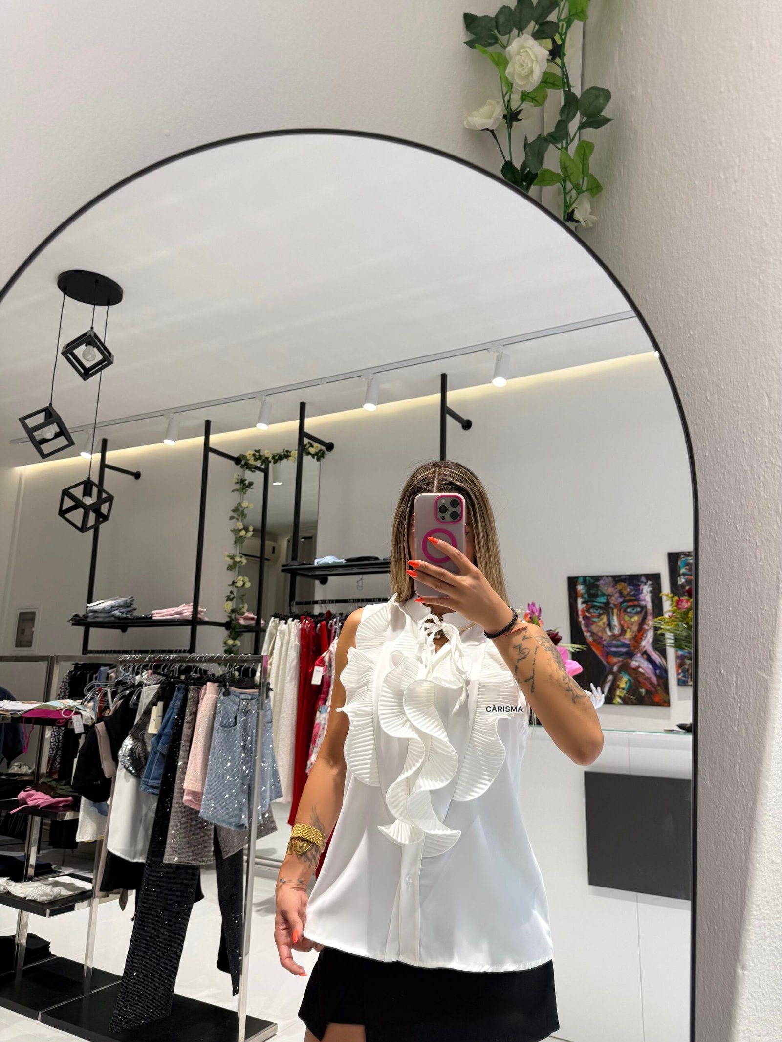 Το Volánta είναι ένα εντυπωσιακό sleeveless πουκάμισο με oversized βολάν που κλέβουν την παράσταση. Διαθέσιμο σε λευκό και μαύρο, συνδυάζει ρομαντισμό με μοντέρνα δομή και θηλυκή αυτοπεποίθηση. Το δέσιμο στο λαιμό προσθέτει μια ανάλαφρη, κομψή πινελιά που απογειώνει κάθε εμφάνιση — από πρωινό office look μέχρι βραδινή έξοδο.