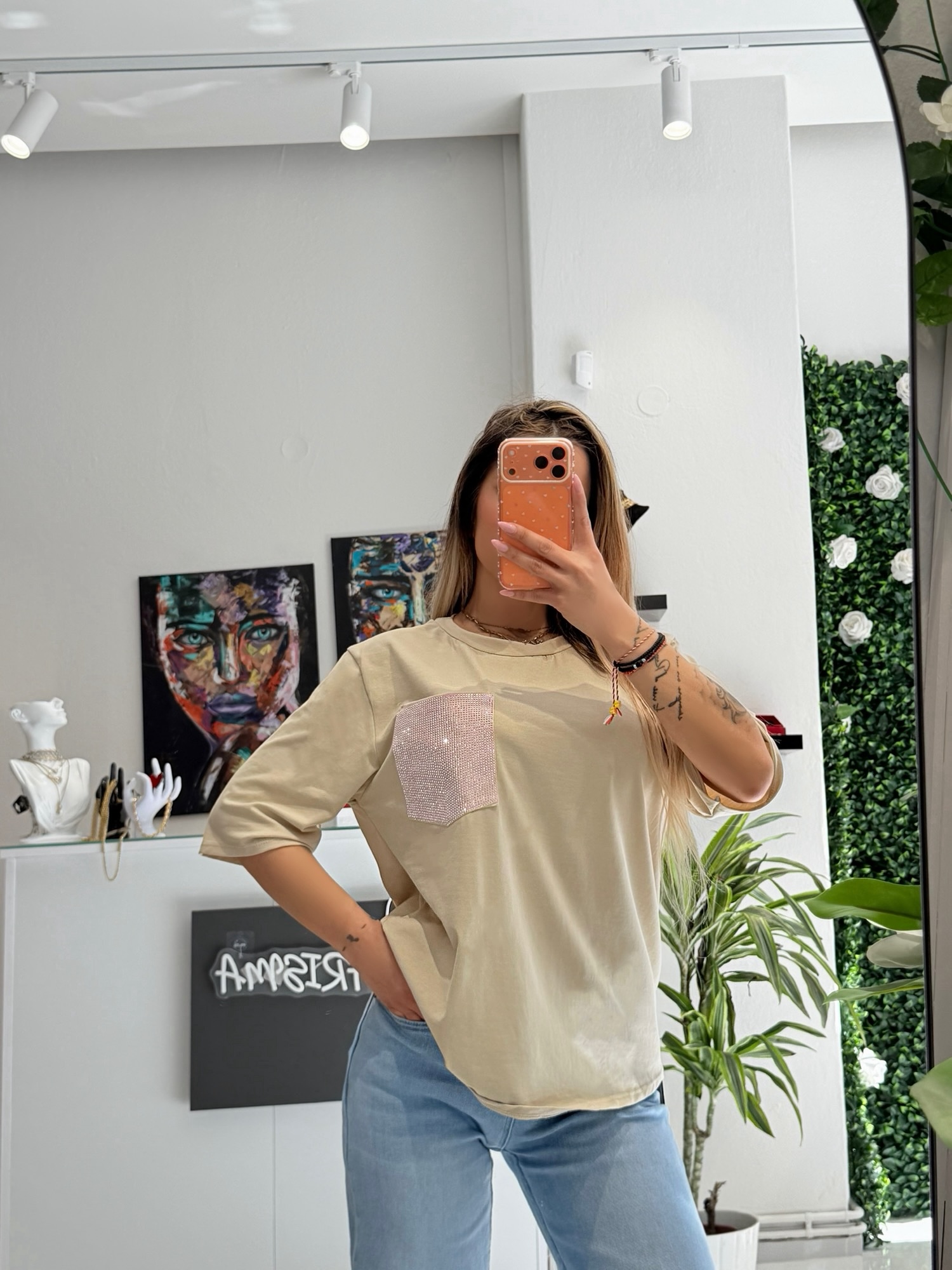 • Glam Λεπτομέρεια: Η μπροστινή τσέπη είναι διακοσμημένη με πυκνά ροζ στρας, δίνοντας έναν luxury χαρακτήρα στο κατά τα άλλα minimal look της μπλούζας.