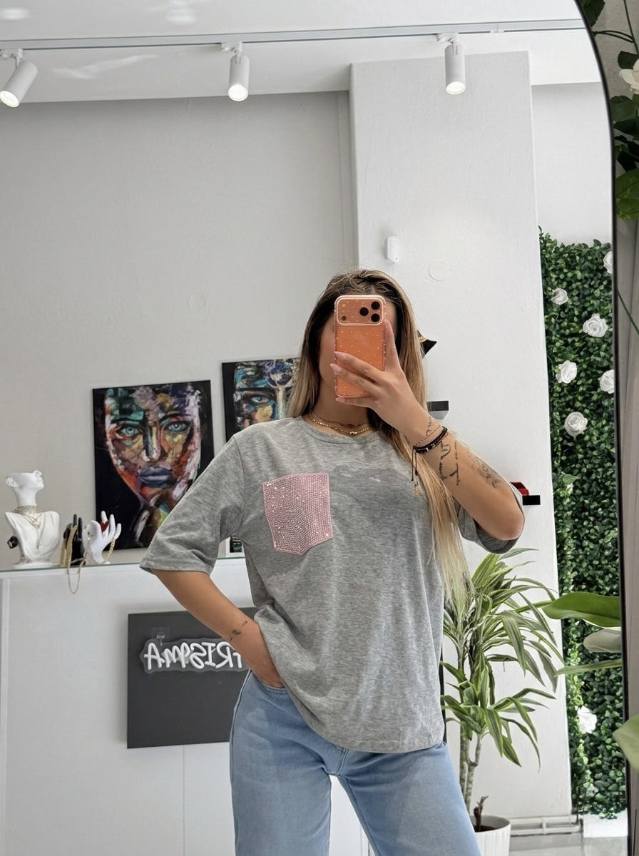 • Glam Λεπτομέρεια: Η μπροστινή τσέπη είναι διακοσμημένη με πυκνά ροζ στρας, δίνοντας έναν luxury χαρακτήρα στο κατά τα άλλα minimal look της μπλούζας.