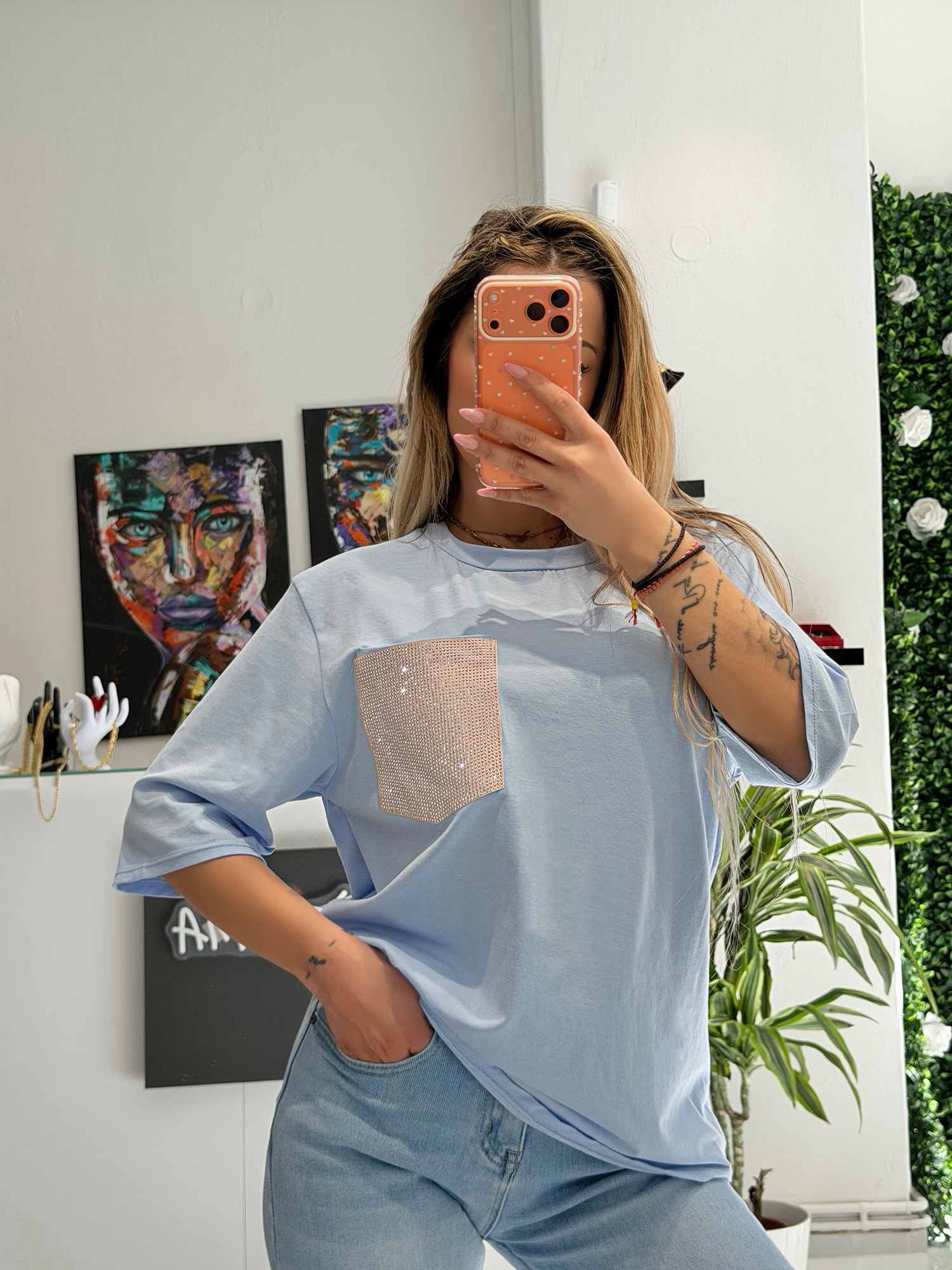 • Glam Λεπτομέρεια: Η μπροστινή τσέπη είναι διακοσμημένη με πυκνά ροζ στρας, δίνοντας έναν luxury χαρακτήρα στο κατά τα άλλα minimal look της μπλούζας.